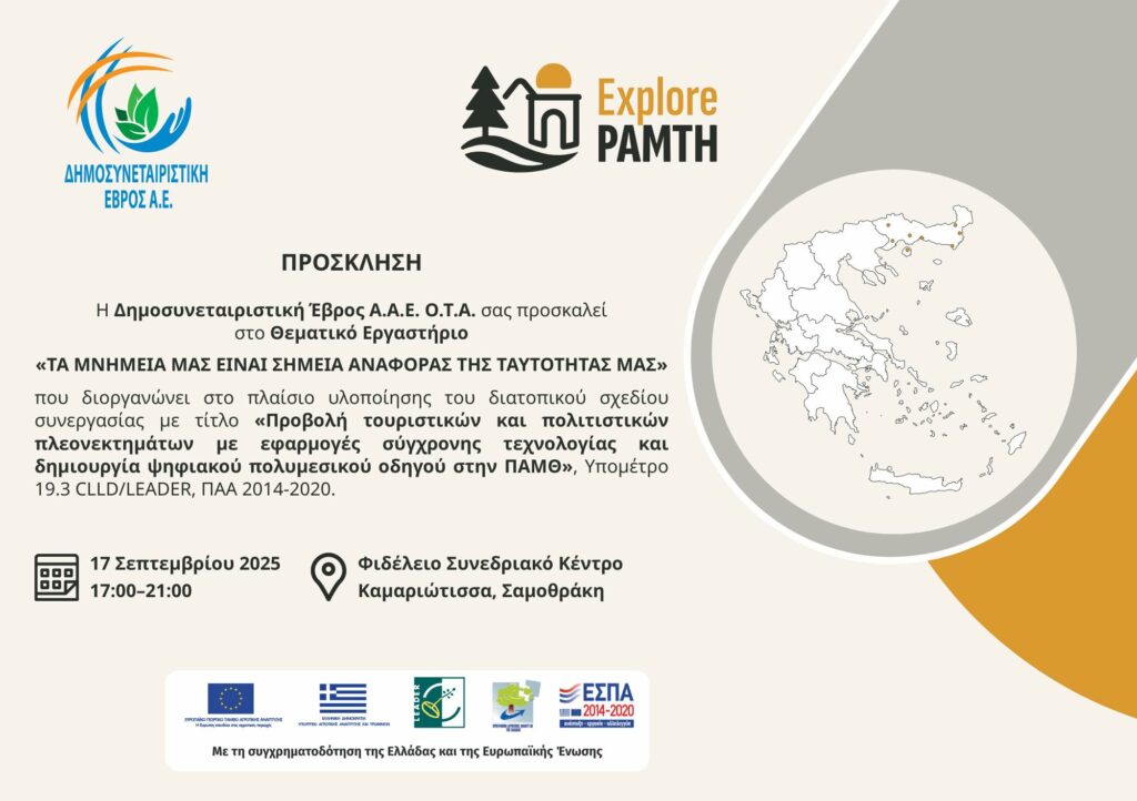 Η Δημοσυνεταιριστική Έβρος Α.Ε. – Ανώνυμη Αναπτυξιακή Εταιρεία Ο.Τ.Α., σε συνεργασία με τον Δήμο Σαμοθράκης, σας προσκαλεί σε ένα θεματικό εργαστήριο με θέμα: