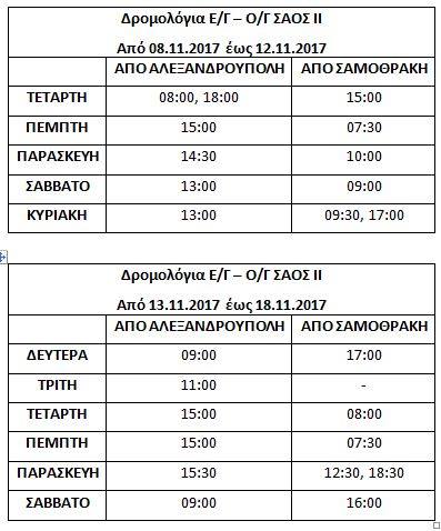 Το ΣΑΟΣ ΙΙ από αύριο Τετάρτη 8 Νοεμβρίου 2017 έως και Σάββατο 18 Νοεμβρίου 2017 για την κάλυψη της επιβατικής κίνησης θα εκτελέσει δρομολόγια σύμφωνα με το παρακάτω πρόγραμμα.