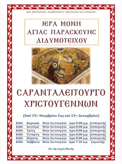 Παρακάτω ακολουθεί και το πρόγραμμα Σαρανταλείτουργο Χριστουγέννων της Ιεράς Μονής Αγίας Παρασκευής Διδυμοτείχου