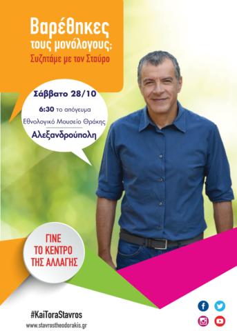 Σε Αλεξανδρούπολη και Σαμοθράκη θα βρεθεί το Σάββατο 28 Οκτωβρίου 2017 ο επικεφαλής του “Ποταμιού” Σταύρος Θεοδωράκης.