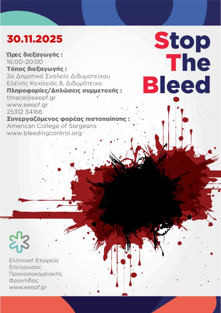 Για πρώτη φορά στην περιοχή, η Ελληνική Εταιρεία Επείγουσας Προνοσοκομειακής Φροντίδας (Ε.Ε.Ε.Π.Φ.), σε συνεργασία με την American College of Surgeons, διοργανώνει στο Διδυμότειχο το διεθνώς αναγνωρισμένο σεμινάριο STOP THE BLEED – ένα πρόγραμμα εκπαίδευσης για την άμεση αντιμετώπιση απειλητικών αιμορραγιών.