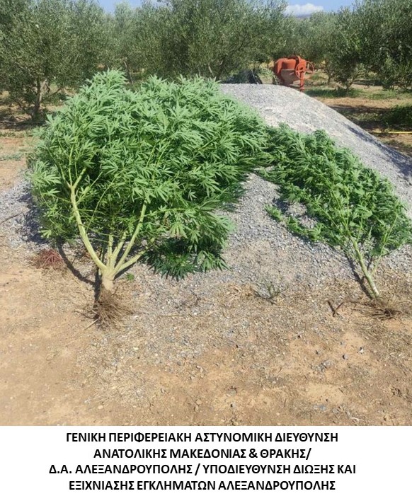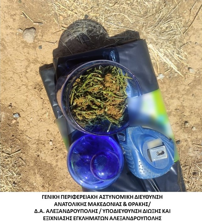 Στην δεύτερη περίπτωση, την 12-9-2025 το μεσημέρι σε αγροτική περιοχή της Αλεξανδρούπολης, αστυνομικοί του Τμήματος Δίωξης Ναρκωτικών της Υποδιεύθυνσης Δίωξης και Εξιχνίασης Εγκλημάτων Αλεξανδρούπολης συνέλαβαν έναν αλλοδαπό, διότι σε έρευνα που πραγματοποίησαν με τη συνδρομή του αστυνομικού σκύλου «LAIKA» της ίδιας Υπηρεσίας σε αγρόκτημά ιδιοκτησίας του του και στην οικία του εντόπισαν και κατάσχεσαν συνολικά από την κατοχή του -2- δενδρύλλια κάνναβης ύψους -2,2- και -3- μέτρων, ποσότητα ακατέργαστης κάνναβης συνολικού βάρους -192,1 γραμμαρίων και -2- μεταλλικούς τρίφτες.