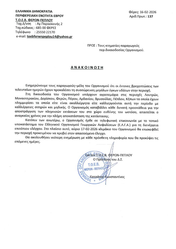 Παράλληλα, ο ΤΟΕΒ Φερών–Πέπλου συνεχίζει τις προσπάθειες αποστράγγισης των πληγεισών εκτάσεων εντός του χώρου ευθύνης του, επισημαίνοντας ότι απαιτείται χρόνος για την πλήρη αποκατάσταση της κατάστασης.
