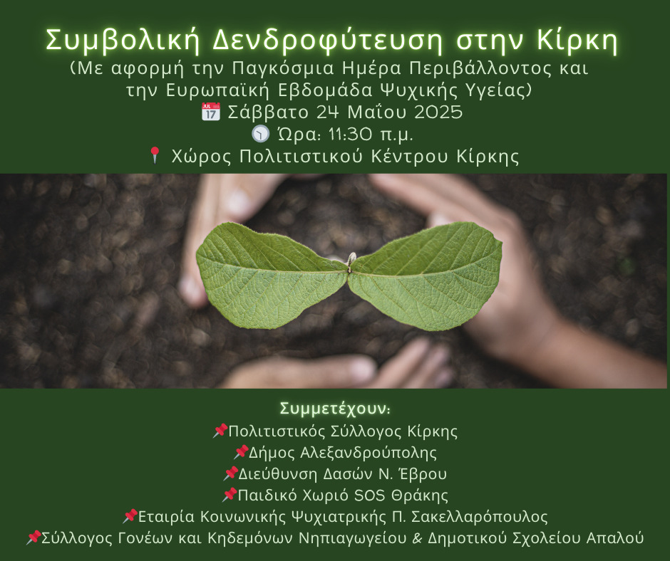 Το Σάββατο 24 Μαΐου 2025 και ώρα 11:30 π.μ., στην Κίρκη, θα πραγματοποιηθεί εκδήλωση συμβολικής δενδροφύτευσης, στο πλαίσιο μιας κοινής πρωτοβουλίας για την ενίσχυση της περιβαλλοντικής ευαισθητοποίησης, της κοινωνικής ενσυναίσθησης και της συνεργασίας μεταξύ φορέων και πολιτών, με αφορμή την Παγκόσμια Ημέρα Περιβάλλοντος και την Ευρωπαϊκή Εβδομάδα Ψυχικής Υγείας