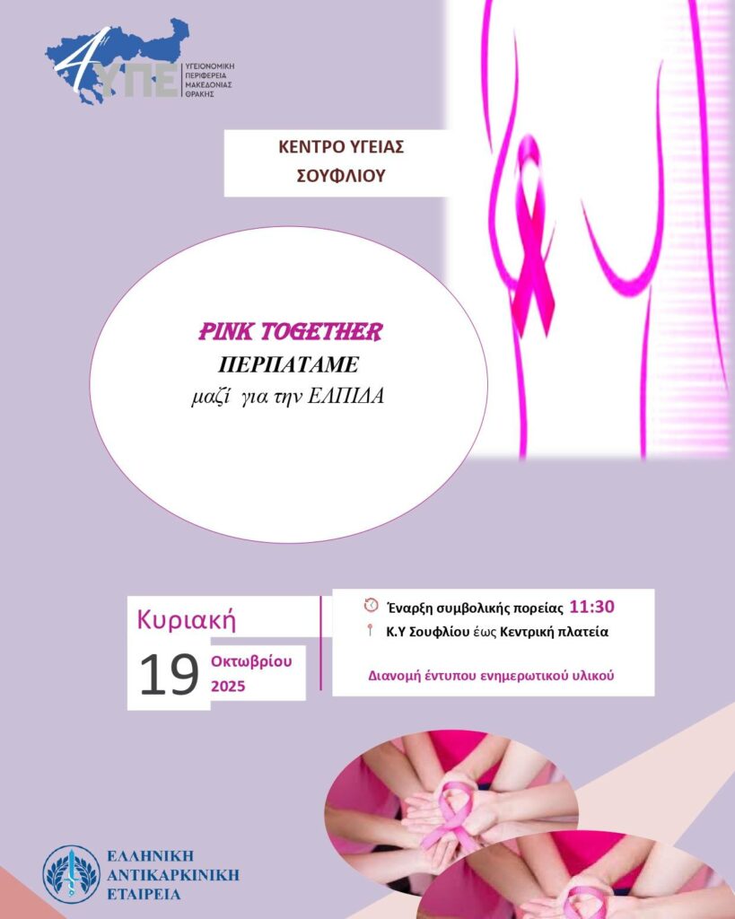 Ο Δήμος Σουφλίου σας προσκαλεί στις δράσεις ενημέρωσης και ευαισθητοποίησης που πραγματοποιεί το Κέντρο Υγείας Σουφλίου, όπως κάθε χρόνο, στο πλαίσιο του Οκτωβρίου – Παγκόσμιου Μήνα Ευαισθητοποίησης για τον Καρκίνο του Μαστού.
