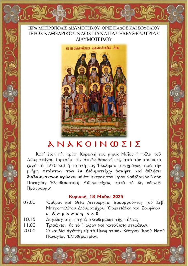 Η «Τράπεζα Αγάπης» του Ιερού Ενοριακού Ναού Κοιμήσεως Θεοτόκου Διδυμοτείχου, υπό την αιγίδα της Ιεράς Μητροπόλεως Διδυμοτείχου, Ορεστιάδος και Σουφλίου και με τη στήριξη του Δήμου Διδυμοτείχου, διοργανώνει την «Συναυλία Αγάπης & Αλληλεγγύης», την Κυριακή 18 Μαΐου 2025 και ώρα 20:00, στο Πνευματικό Κέντρο του Ιερού Ναού Παναγίας Ελευθερώτριας Διδυμοτείχου.