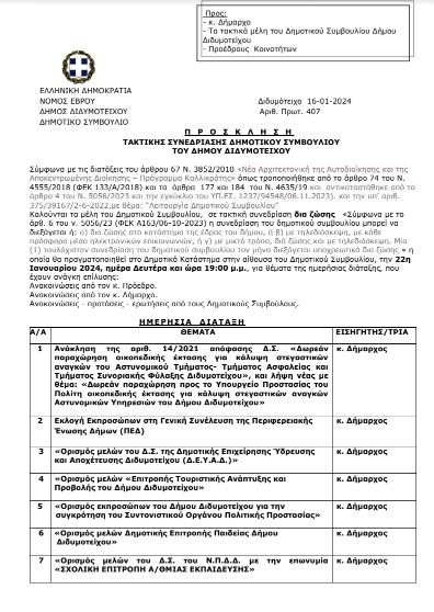 Σήμερα, Δευτέρα 22.01.2024 και ώρα 19.00 θα πραγματοποιηθεί συνεδρίαση για το Δημοτικό Συμβούλιο στο Δήμο Διδυμοτείχου.