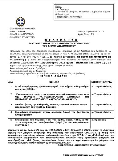 Συνεδριάζει σήμερα, Τετάρτη 12 Οκτωβρίου και ώρα 19:00 το Δημοτικό Συμβούλιο Διδυμοτείχου δια ζώσης αλλά και ταυτόχρονα με τηλεδιάσκεψη