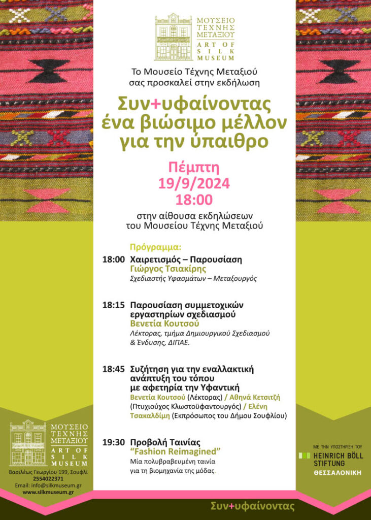Συν+υφαίνοντας ένα βιώσιμο μέλλον για την ύπαιθρο Πέμπτη 19 Σεπτεμβρίου 2024, ώρα 6 μ.μ. Μουσείο Τέχνης Μεταξιού – Σουφλί Έβρου