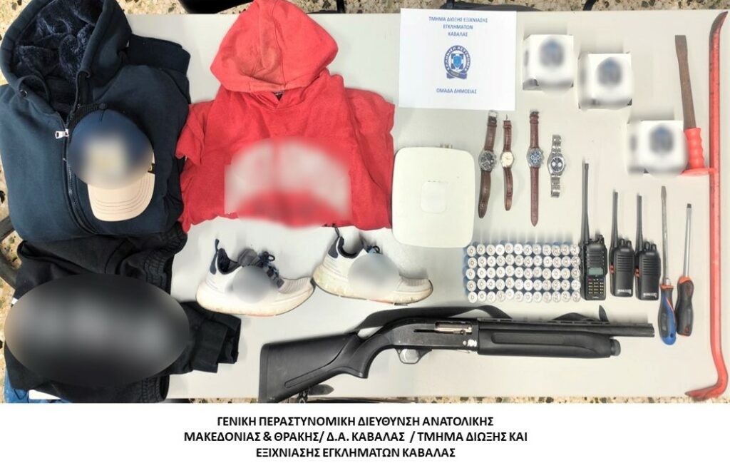 Από τις έρευνες που πραγματοποιήθηκαν στις οικίες των δραστών, στα οχήματα που χρησιμοποιούσαν καθώς και την κατοχή τους, βρέθηκαν και κατασχέθηκαν κατά περίπτωση -1- κυνηγετικό όπλο για το οποίο έχει δηλωθεί κλοπή την 18-1-2025 σε αστυνομική υπηρεσία των Σερρών, -60- κυνηγετικά φυσίγγια, -3- φορητοί πομποδέκτες, διαρρηκτικά εργαλεία, είδη ένδυσης – υπόδησης που χρησιμοποιούσαν οι δράστες κατά τη διάπραξη των κλοπών και ένα ζεύγος πινακίδων κυκλοφορίας το οποίο αποδόθηκε στον ιδιοκτήτη του.