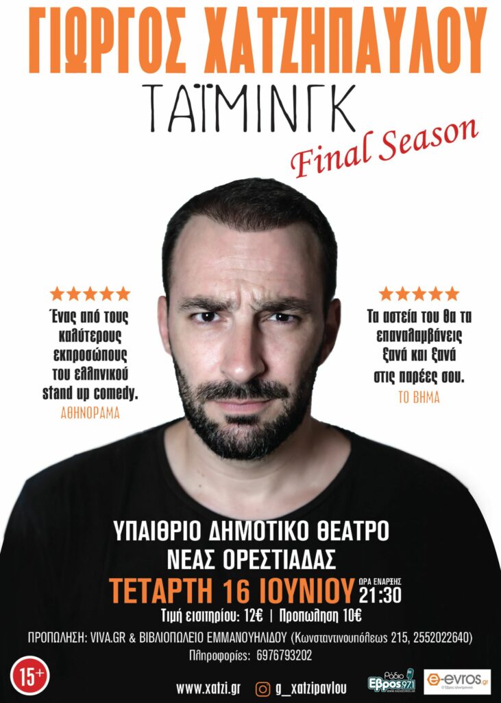 Ο Γιώργος Χατζηπαύλου κλείνει φέτος τον κύκλο της τελευταίας stand-up comedy παράστασής του, η οποία έχει τον τίτλο «Τάιμινγκ».