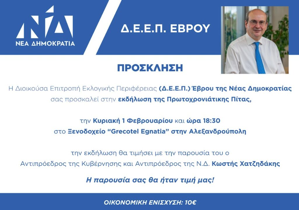 Η Διοικούσα Επιτροπή Εκλογικής Περιφέρειας (Δ.Ε.Ε.Π. – πρ. ΝΟΔΕ) Έβρου της Νέας Δημοκρατίας, σας προσκαλεί στην εκδήλωση κοπής της πρωτοχρονιάτικης πίτας, η οποία θα πραγματοποιηθεί την Κυριακή 1 Φεβρουαρίου 2026 και ώρα 18:30, στο ξενοδοχείο Grecotel Egnatia στην Αλεξανδρούπολη.