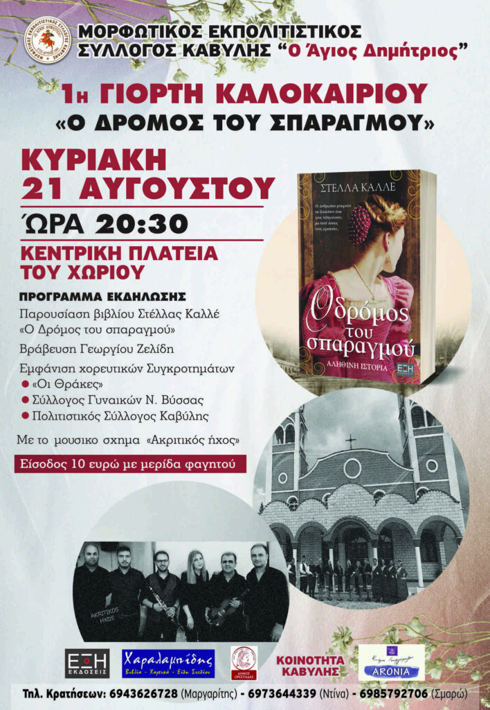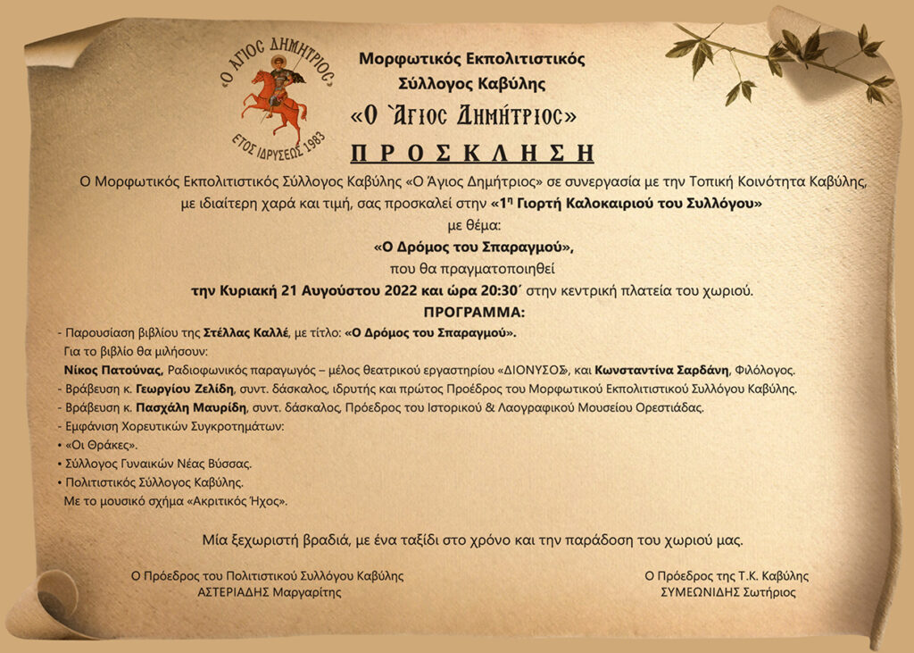 Ο Μορφωτικός Εκπολιτιστικός Σύλλογος Καβύλης “Ο Άγιος Δημήτριος” σε συνεργασία με την Τοπική Κοινότητα Καβύλης διοργανώνουν την «1η Γιορτή Καλοκαιριού του Συλλόγου» με θέμα «Ο Δρόμος του Σπαραγμού», την Κυριακή 21 Αυγούστου 2022 και ώρα 20:30΄ στην κεντρική πλατεία του χωριού.