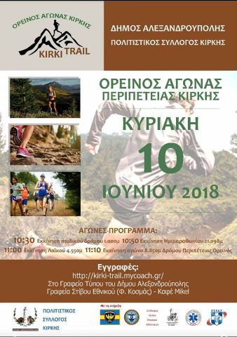 Ο Πολιτιστικός Σύλλογος Κίρκης σε συνεργασία με το Δήμο Αλεξ/πολης, την Τοπική Κοινότητα Κίρκης και τη 12η Μεραρχία και συνεπικουρούμενος από το τμήμα στίβου του Εθνικού Αλεξ/πολης, τον Σύνδεσμο Κριτών Κλασικού Αθλητισμού Θράκης, τη Λέσχη Μοτοσυκλετιστών Αλεξ/πολης , το ΕΚΑΒ, διοργανώνουν τον 2ο αγώνα δρόμου περιπέτειας σε ορεινό έδαφος στην Κίρκη Αλεξ/πολης, με την ονομασία 2o “ΚΙRΚI TRAIL”, στις 10 Ιουνίου 2018, ημέρα Κυριακή, στα πλαίσια των εκδηλώσεων «Ελευθέρια» σε Ροδόπη και Έβρο, με ώρα έναρξης στις 10:30 πμ.