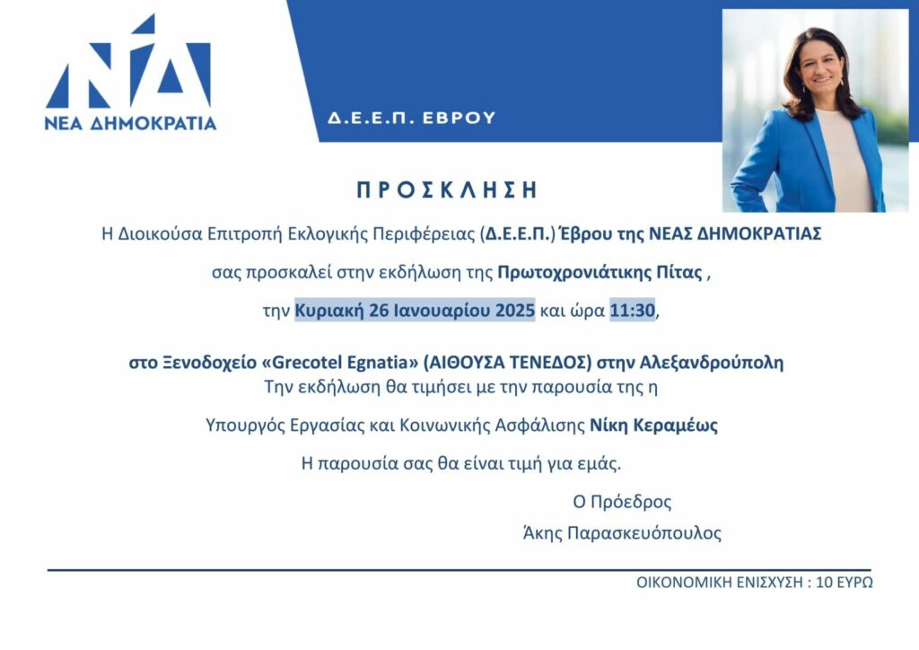 Η εκδήλωση θα πραγματοποιηθεί την Κυριακή 26 Ιανουαρίου στο Grecotel Egnatia ΑΙΘΟΥΣΑ ΤΕΝΕΔΟΣ και ώρα 11:30 σύμφωνα με την πρόσκληση της ΔΕΕΠ Έβρου: