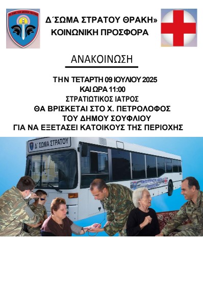 Στο πλαίσιο του προγράμματος κοινωνικής προσφοράς των Ενόπλων Δυνάμεων, στρατιωτικός ιατρός θα βρίσκεται στο χωριό Πετρόλοφος του Δήμου Σουφλίου την Τετάρτη 9 Ιουλίου 2025 και ώρα 11:00 για να εξετάσει κατοίκους της περιοχής.