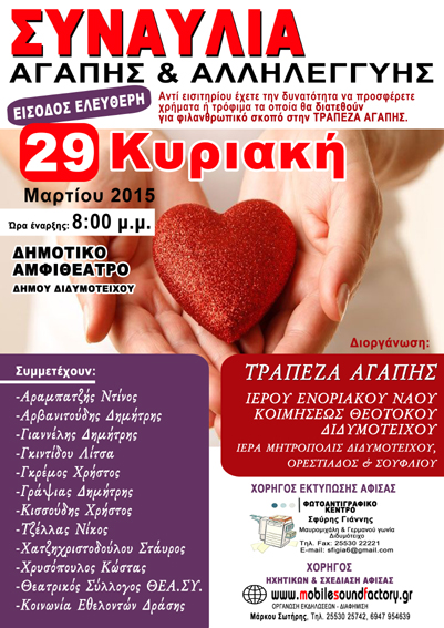 Εκδήλωση με σκοπό την ενίσχυση της Τράπεζας Αγάπης της Ιεράς Μητροπόλεως Διδυμοτείχου διοργανώνει η Ενορία του Ιερού Ναού Κοιμήσεως Θεοτόκου Διδυμοτείχου την Κυριακή 29 Μαρτίου 2015 και ώρα 8μμ.