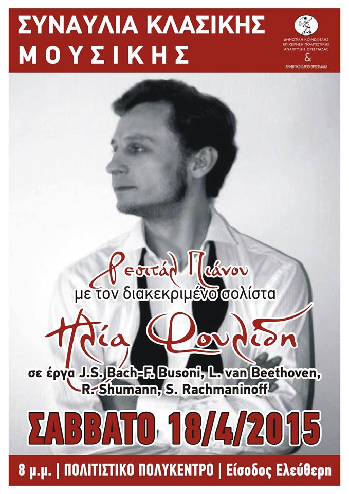 Η Δημοτική Κοινωφελής Επιχείρηση Πολιτιστικής Ανάπτυξης και το Δημοτικό Ωδείο Ορεστιάδας διοργανώνουν συναυλία κλασικής μουσικής – ρεσιτάλ πιάνου με τον διακεκριμένο σολίστα Ηλία Φουλίδη, σε έργα J. S. Bach – F. Bysoni, L. Van Beethoven, R. Schumann και S. Rachmaninoff.