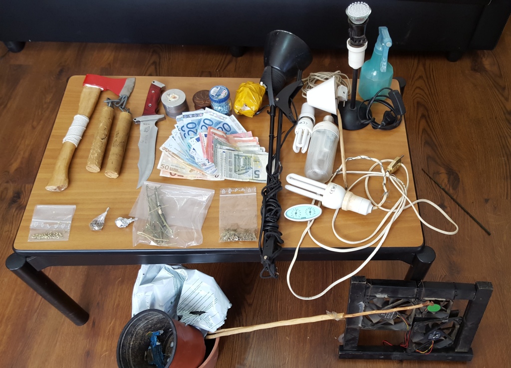 Σε έρευνα που ακολούθησε στην πατρική οικία του 25χρονου, σε αγροτική περιοχή του Έβρου, εντοπίσθηκε ο 47χρονος πατέρας του, ενώ στο εσωτερικό της βρέθηκαν και κατασχέθηκαν: