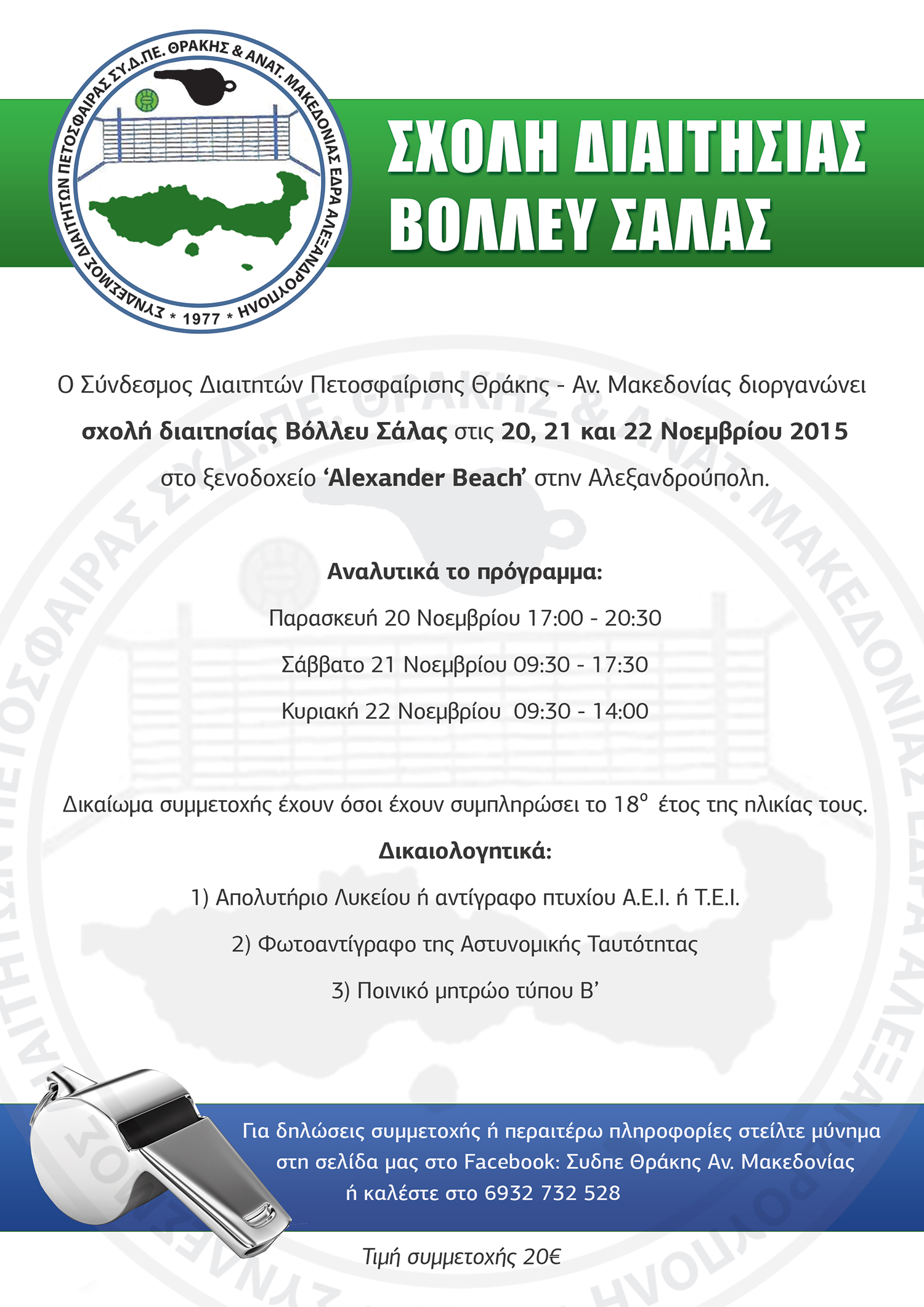 Ο Σύνδεσμος Διαιτητών Πετοσφαίρισης Θράκης – Αν. Μακεδονίας διοργανώνει σχολή διαιτησίας Βόλλευ Σάλας στις 20,21 και 22 Νοεμβρίου 2015 στο ξενοδοχείο Alexander Beach στην Αλεξανδρούπολη.Δικαίωμα συμμετοχής έχουν όσοι έχουν συμπληρώσει το 18ο έτος της ηλικίας τους και απαραίτητα δικαιολογητικά είναι 1)Απολυτήριο Λυκείου η αντίγραφο Πτυχίου ΑΕΙ ή ΤΕΙ 2)Φωτοαντίγραφο Αστυνομικής Ταυτότητας 3)Ποινικό Μητρώο τύπου Β