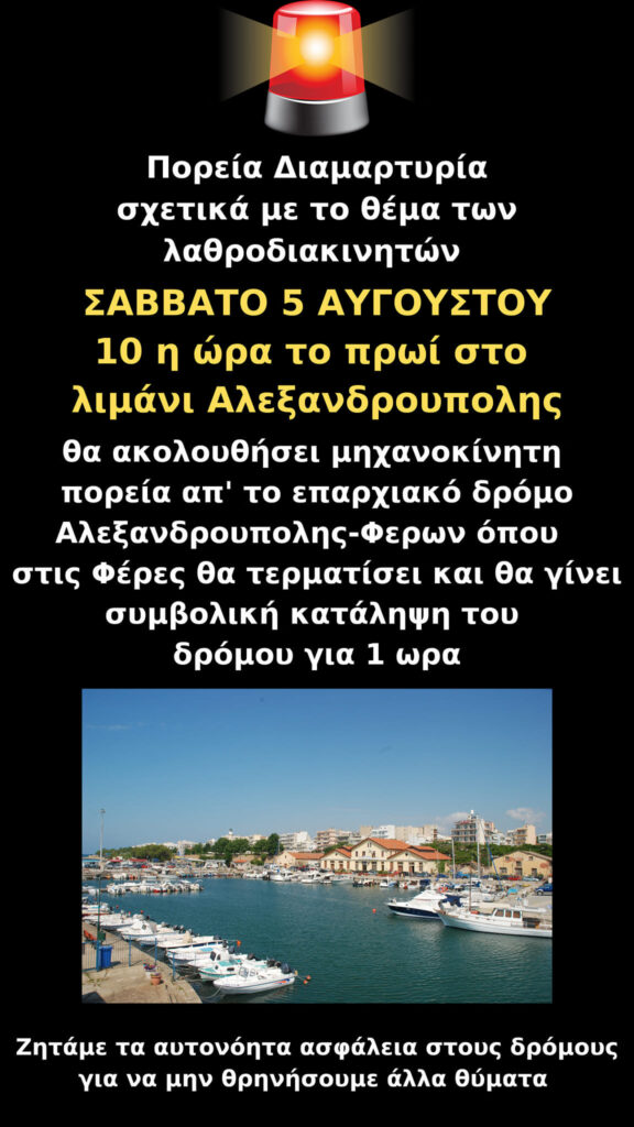 Η διαμαρτυρία προγραμματίζεται για το Σάββατο 5 Αυγούστου και θα ξεκινήσει με συγκέντρωση στο λιμάνι της Αλεξανδρούπολης στις 10 το πρωί. Θα ακολουθήσει μηχανοκίνητη πορεία από την επαρχιακή οδό Αλεξανδρούπολης – Φερών, εκεί στις Φέρες θα τερματίσει και θα γίνει “συμβολική κατάληψη” του δρόμου για μία ώρα.