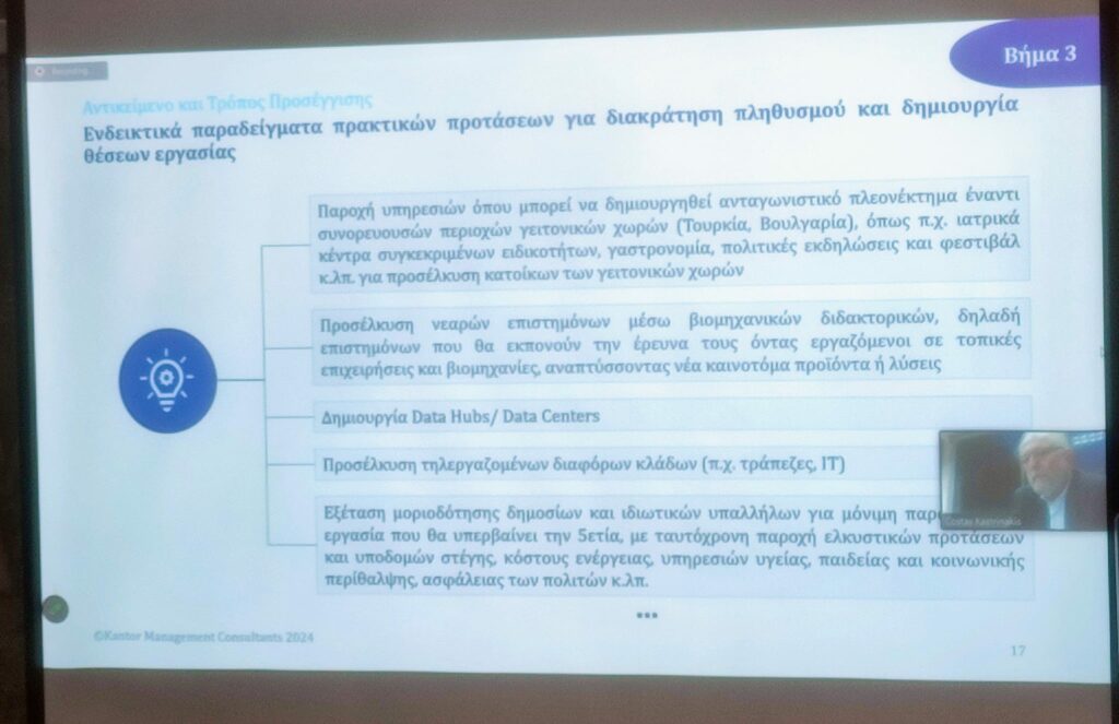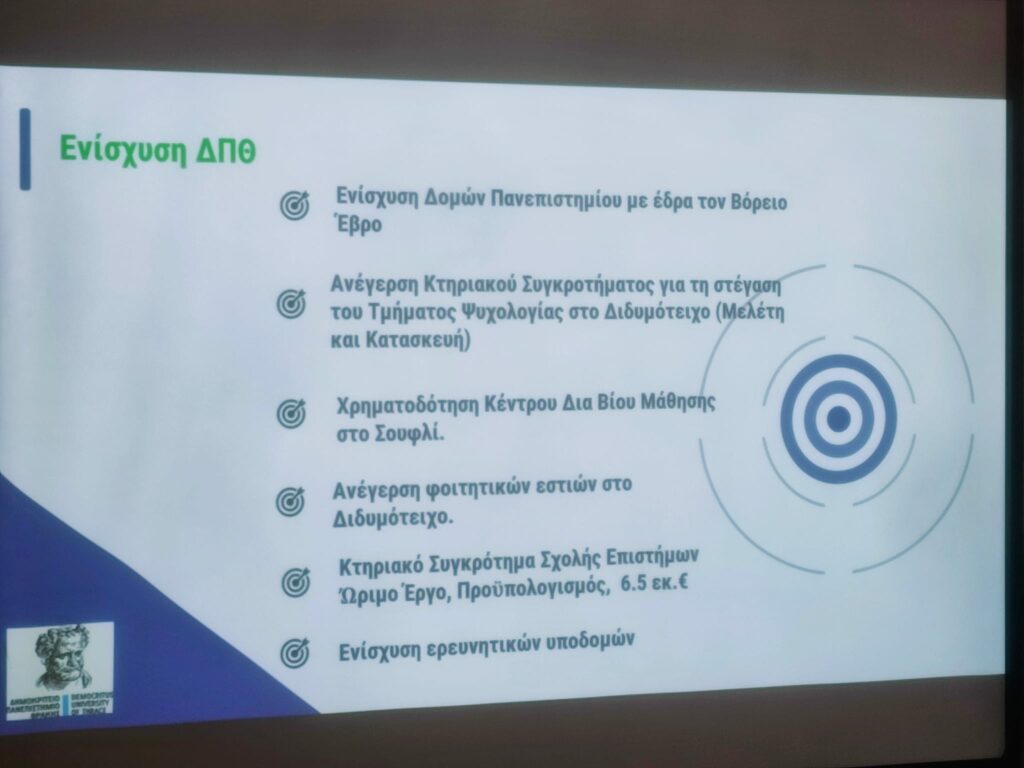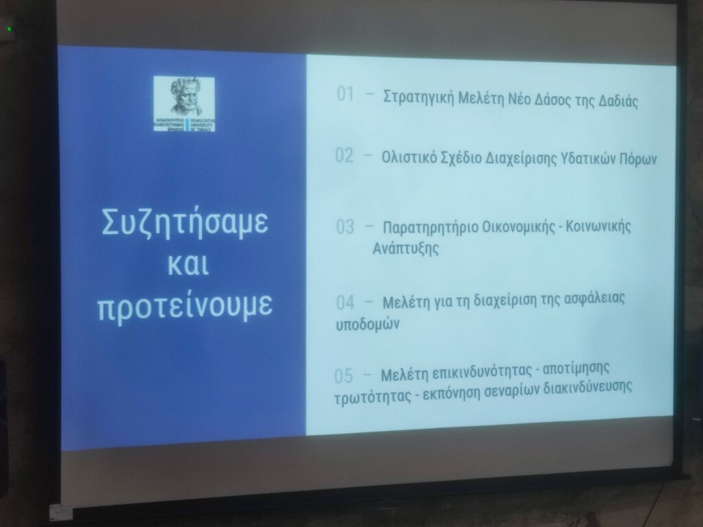 “Σήμερα παρουσιάσαμε τις προτάσεις μας, ενώ έγινε μια τεχνική συνάντηση πριν τη συνεδρίαση της Επιτροπής, και εκεί νομίζω είχαμε μία πάρα πολύ καλή συνεργασία και με το μελετητή του master plan, με τα στελέχη των υπουργείων και την ομάδα του Σταύρου Μπένου. Εκεί μας δόθηκε η δυνατότητα να πούμε την άποψή μας όπως συζητήθηκε στο Πανεπιστήμιο και να καταθέσουμε τις προτάσεις μας έτσι ώστε αυτό το οποίο θα οικοδομηθεί και θα ανορθωθεί στο οικοσύστημα να είναι ανθεκτικότερο τόσο οικονομικά, κοινωνικά, αλλά και περιβαλλοντικά, μιας και αυτό είναι το ζητούμενο των κατοίκων της περιοχής“. Επίσης, ο κ. Μάρης αναφέρθηκε στη νέα δράση “DUTH to the people” αλλά και στις προτεραιότητες που θα χρηματοδοτήσει το Πανεπιστήμιο. Τέλος, έγινε ιδιαίτερη αναφορά στην υποστηρικτική πρωτοβουλία του Πανεπιστημίου σε ψυχολογικό επίπεδο, καθώς “έγινε κοινά αποδεκτό πως υπάρχει αυτή ανάγκη“.