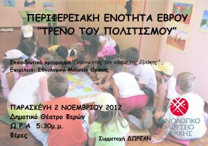 Η Περιφερειακή Ενότητα Έβρου, σε συνεργασία με το Εθνολογικό Μουσείο Θράκης, στο πλαίσιο των δράσεων του «Τρένου του Πολιτισμού», διοργανώνει το εκπαιδευτικό πρόγραμμα «Ερευνώντας τον κόσμο της Θράκης», μέσα από το οποίο τα παιδιά ενστερνίζονται ιδέες γύρω από την θεματική «Επαγγέλματα, διατροφή & τοπικά προϊόντα της Θράκης».