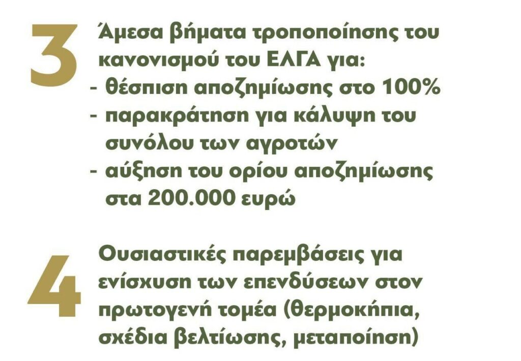 • 100% αποζημίωση μέσω ΕΛΓΑ, με αύξηση του ανώτατου ορίου αποζημίωσης στις 200.000 ευρώ, χωρίς αύξηση εισφορών.