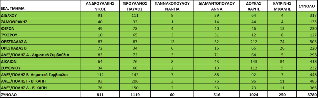 Με συμμετοχή ρεκόρ, περίπου 3.800 μέλη και φίλοι του ΠΑΣΟΚ – Κινήματος Αλλαγής ψήφισαν στον Έβρο για τον επόμενο Πρόεδρο του κόμματος. Σε αντίθεση, όμως, με την επικράτεια όπου κυριάρχησε ο Νίκος Ανδρουλάκης, οι Εβρίτες επέλεξαν στην πλειοψηφία τους τον Παύλο Γερουλάνο, δίνοντάς του 1119(29,60%) ψήφους. Δεύτερος ο Χάρης Δούκας με 1024(27,09%) ψήφους, ενώ ακολουθούν: Στην τρίτη θέση ο Νίκος Ανδρουλάκης με 811(21,46%) ψήφους, τέταρτη η Άννα Διαμαντουπούλου με 516(13,65%) ψήφους, πέμπτος ο Μιχάλης Κατρίνης με 250(6,61%) ψήφους και έκτη η Νάντια Γιαννακοπούλου με 60(1,59%) ψήφους. Καταμετρήθηκαν και ορισμένα λευκά ψηφοδέλτια χωρίς σταυρό προτίμησης. Αναλυτικά, ανά εκλογικό κέντρο και τμήμα, όπως συγκέντρωσε τα αποτελέσματα το Ράδιο Έβρος: