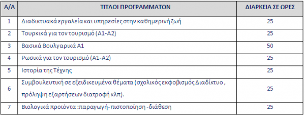 Στο Κ.Δ.Β.Μ. του Δήμου Ορεστιάδας μπορούν να δημιουργηθούν τμήματα για τα ακόλουθα προγράμματα: