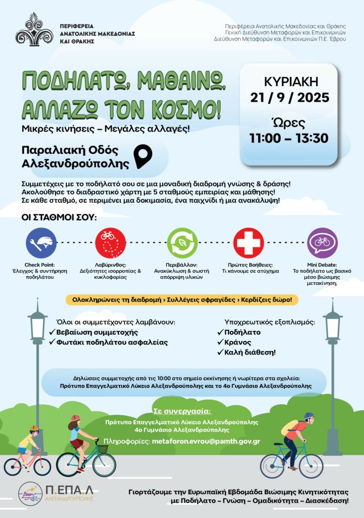 Την Κυριακή 21 Σεπτεμβρίου 2025 και ώρα 11:00 – 13:30 στην παραλιακή οδό Αλεξανδρούπολης, σε συνεργασία με το Πρότυπο Επαγγελματικό Λύκειο Αλεξανδρούπολης και το 4ο Γυμνάσιο Αλεξανδρούπολης, θα πραγματοποιηθεί η ξεχωριστή δράση «Ποδηλατώ, μαθαίνω. Αλλάζω τον κόσμο!».