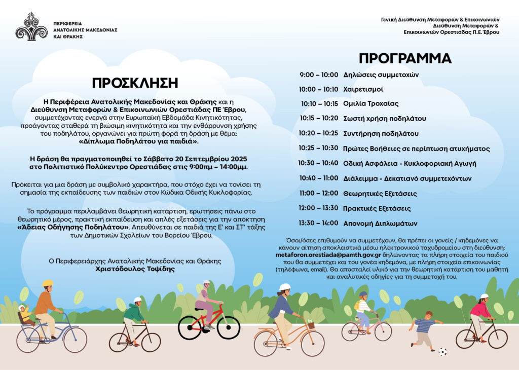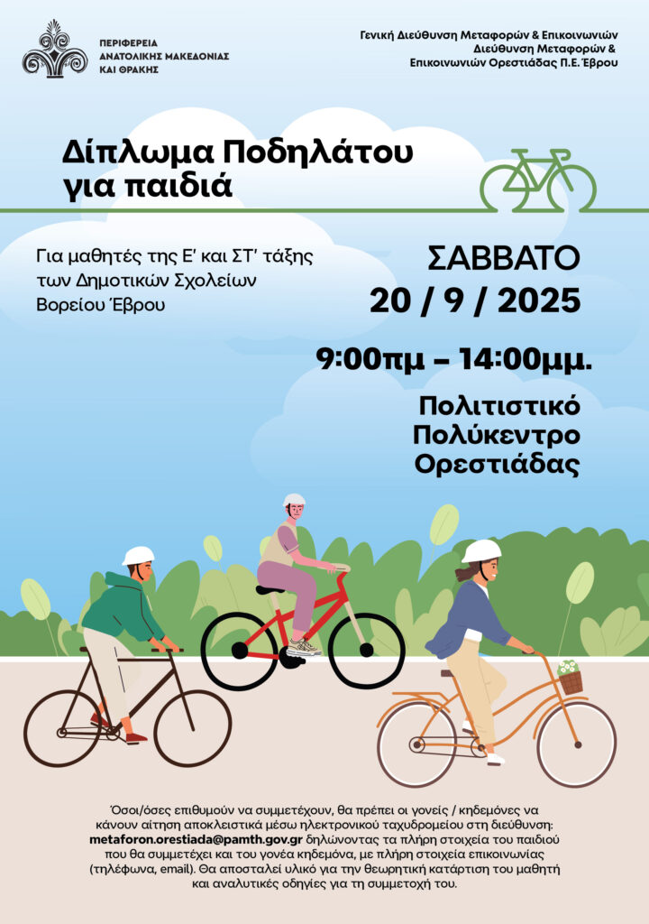Το Σάββατο 20/09/2025 και ώρα 11:00 π.μ. θα πραγματοποιηθεί η δράση «Δίπλωμα ποδηλάτη» (για μαθητές Δημοτικών Σχολείων), στο Πολιτιστικό Πολύκεντρο Δήμου Ορεστιάδας, στην Ορεστιάδα. Προσέλευση μαθητών με ποδήλατο και κράνος. Περιλαμβάνονται: ομιλίες, θεωρητική και πρακτική εξέταση οδήγησης ποδηλάτου, απονομή διπλωμάτων ποδηλάτου.
