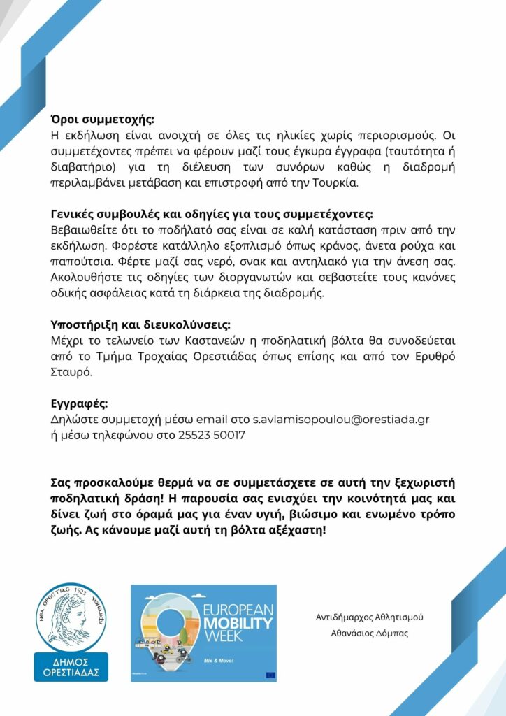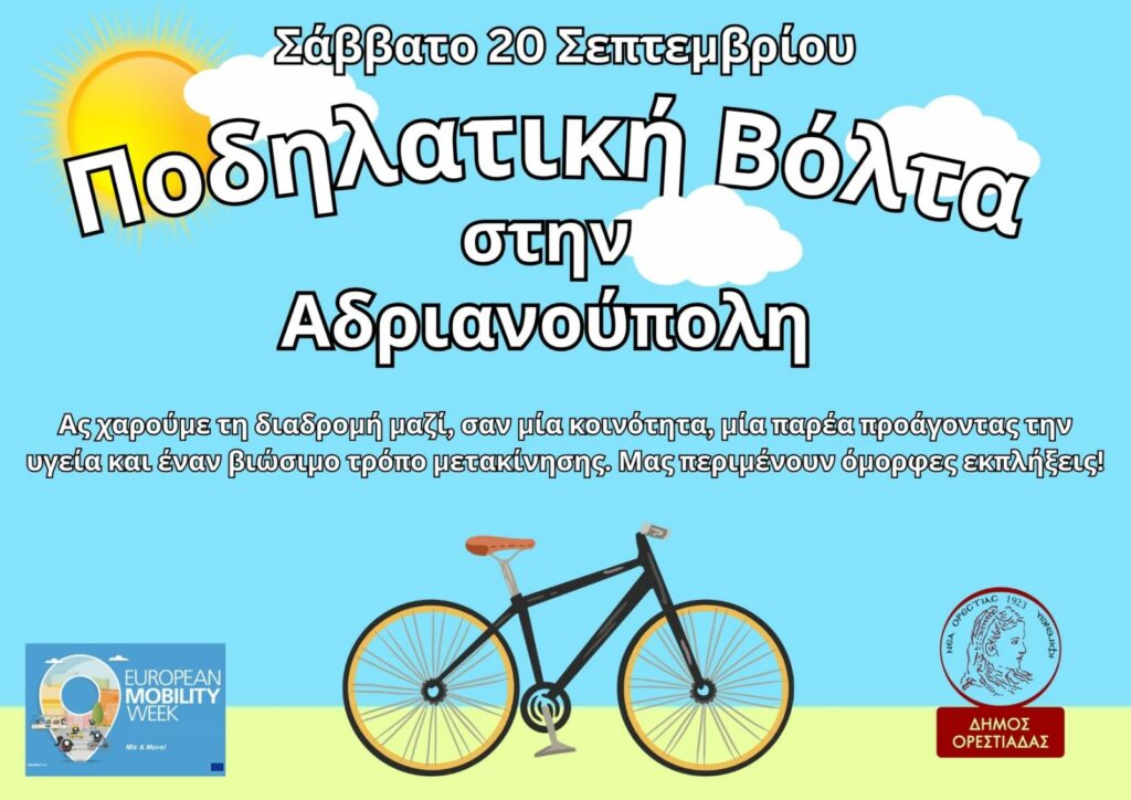 Ο Δήμος Ορεστιάδας στο πλαίσιο της Ευρωπαϊκής Εβδομάδας Κινητικότητας σας προσκαλεί σε μια ξεχωριστή ποδηλατική βόλτα προς την Αδριανούπολη το Σάββατο 20 Σεπτεμβρίου 2025. Η εκδήλωση ενώνει την κοινότητα μας για να προωθήσουμε έναν υγιή τρόπο ζωής και τη βιώσιμη κινητικότητα.