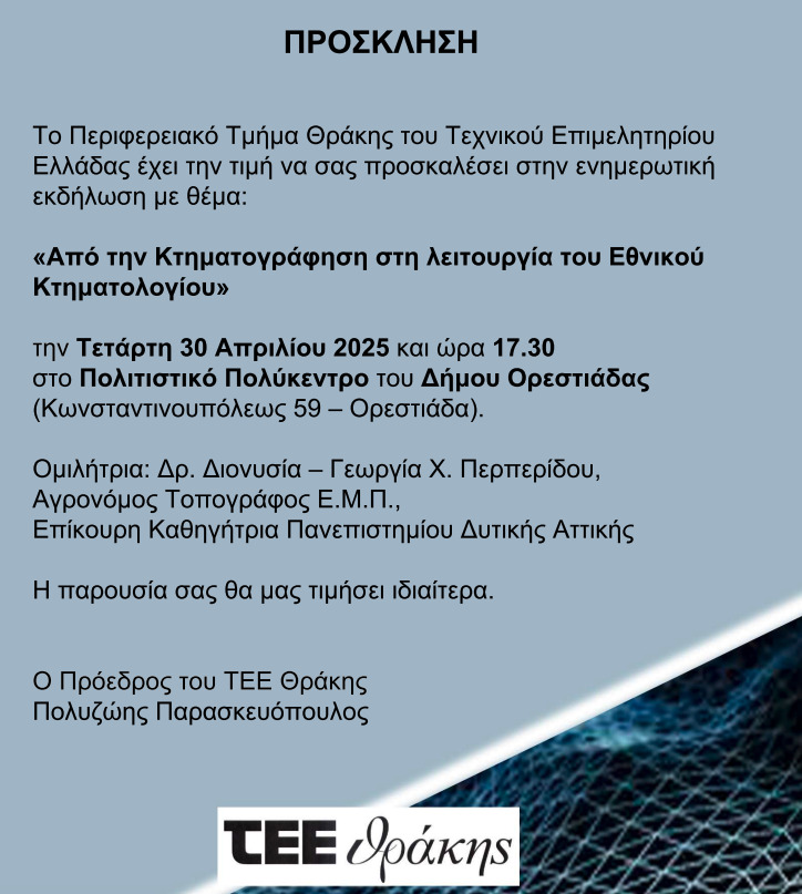 Το Περιφερειακό Τμήμα Θράκης του Τεχνικού Επιμελητηρίου Ελλάδας (Τ.Ε.Ε.) διοργανώνει ενημερωτική εκδήλωση με θέμα: «Από την Κτηματογράφηση στη λειτουργία του Εθνικού Κτηματολογίου»