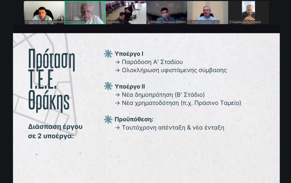 Την Τετάρτη 4 Μαρτίου 2026 πραγματοποιήθηκε, έπειτα από πρόταση του ΤΕΕ Θράκης και με πρωτοβουλία του κ. Σταύρου Μπένου, Πρόεδρο του σωματείου ΔΙΑΖΩΜΑ, συνάντηση των Δημάρχων της Περιφέρειας Ανατολικής Μακεδονίας και Θράκης και της Διαχειριστικής Αρχής της Περιφέρειας με τον Γενικό Γραμματέα Χωρικού Σχεδιασμού και Αστικού Περιβάλλοντος του Υπουργείου Περιβάλλοντος και Ενέργειας, κ. Ευθύμιου Μπακογιάννη, όπως γνωστοποιεί με ανακοίνωσή του το ΤΕΕ Θράκης.