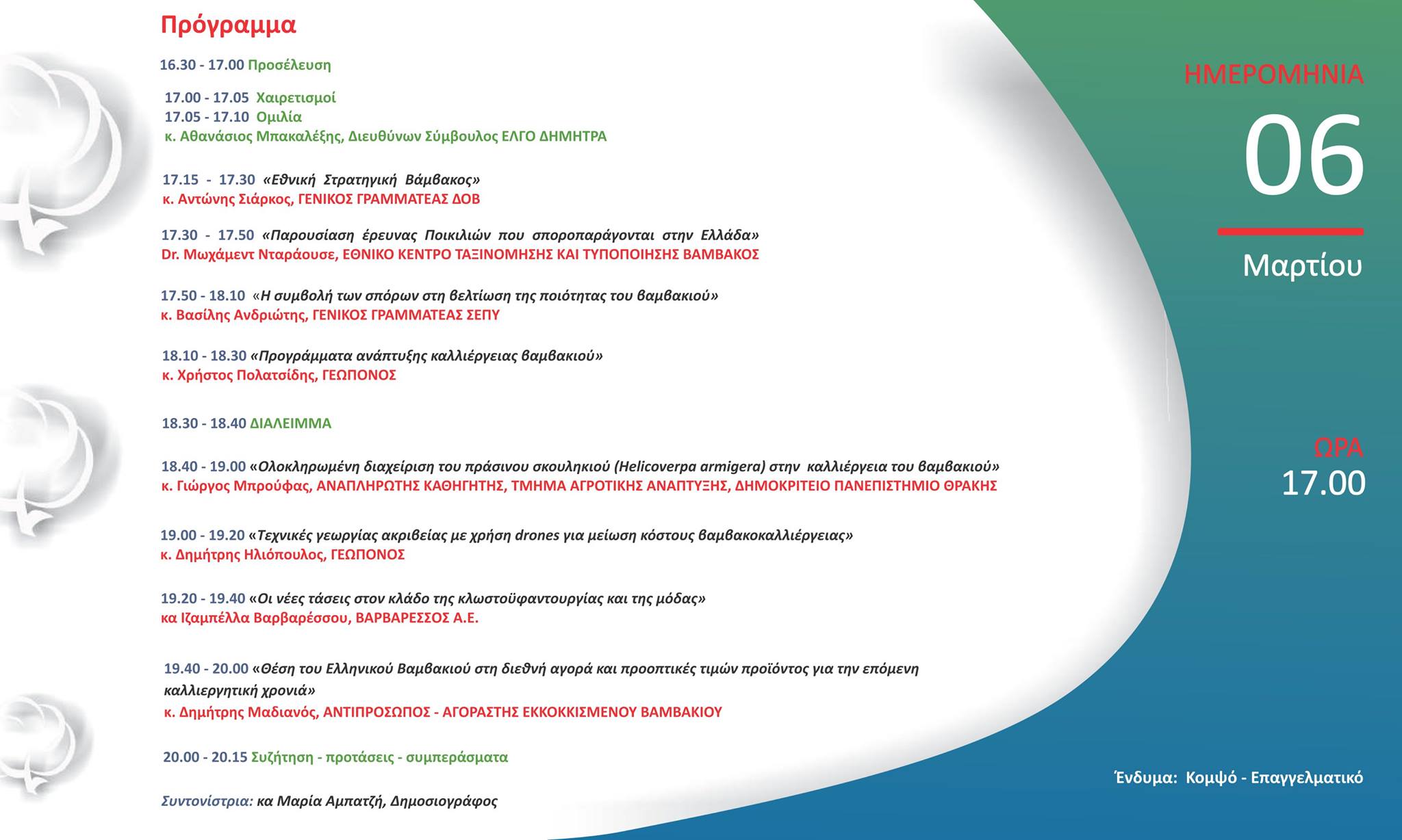 Τελευταία εσπερίδα ΔΟΒ και ΕΛΓΟ ΔΗΜΗΤΡΑ με θέμα: «Εθνική Στρατηγική Βαμβακοκαλλιέργειας – Προοπτικές»