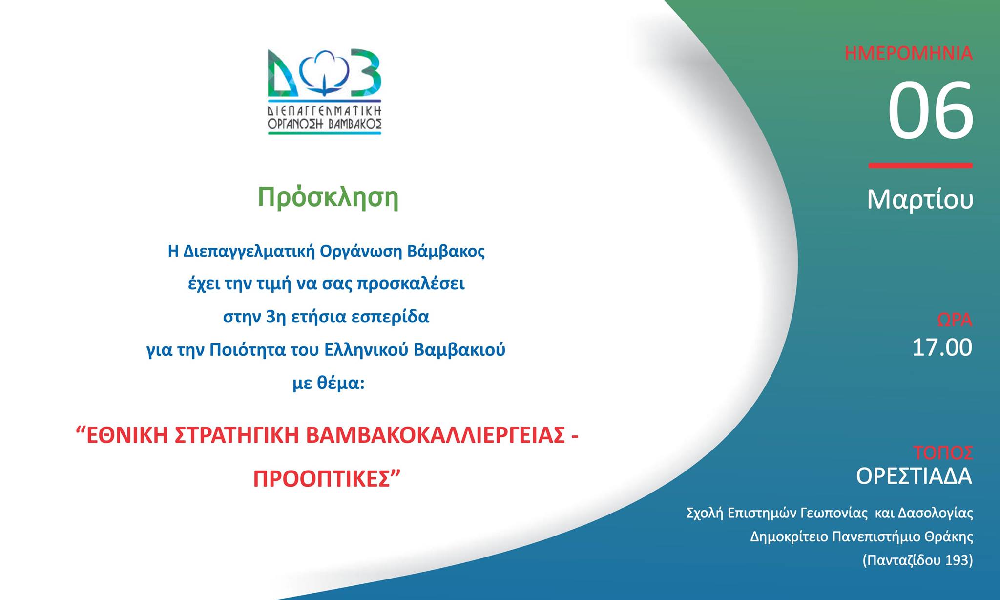 Η τελευταία εσπερίδα για φέτος, θα πραγματοποιηθεί στην Ορεστιάδα, την Τετάρτη 06 Μαρτίου και ώρα 17.00 στην Σχολή Επιστημών Γεωπονίας και Δασολογίας του Δημοκριτείου Πανεπιστημίου Θράκης, με κύριο στόχο την παρουσίαση της Εθνικής Στρατηγικής για την Βαμβακοκαλλιέργεια.