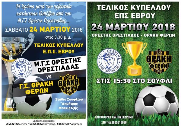 Έφθασε η ώρα του Τελικού του Κυπέλλου της ΕΠΣ Έβρου 2018 για τον Ορέστη Ορεστιάδας και την Θράκη Φερών.