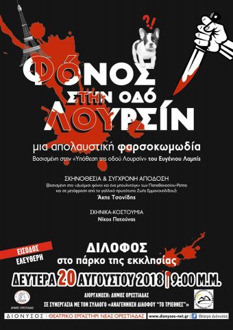 Στις 20 Αυγούστου ο Δίλοφος υποδέχεται το Θεατρικό Εργαστήρι “ΔΙΟΝΥΣΟΣ ” με το έργο “Φόνος στην οδό Λουρσίν” και την παρουσίαση του βιβλίου της Σοφίας Ντούπη “Το Τίμημα”.