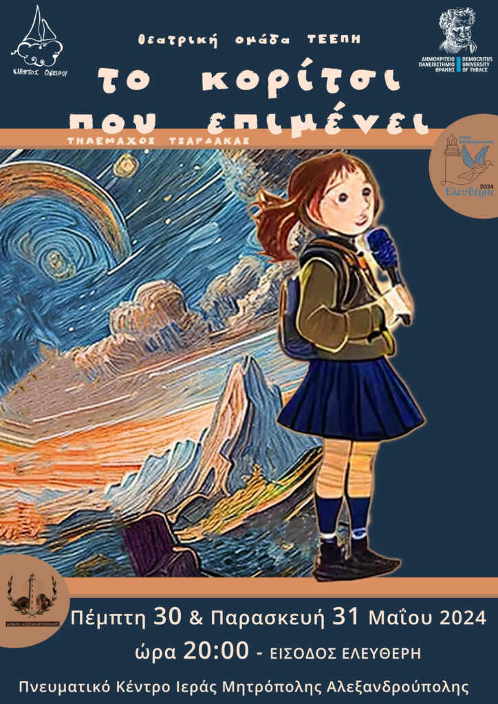 Η θεατρική ομάδα του Τμήματος Επιστημών της Εκπαίδευσης στην Προσχολική Ηλικία της Σχολής Επιστημών Αγωγής του ΔΠΘ «Κιβωτός Ονείρου» συμμετέχει στα Ελευθέρια του Δήμου Αλεξανδρούπολης 2024 με την παράσταση «Το κορίτσι που επιμένει» του Τηλέμαχου Τσαρδάκα, την Πέμπτη 30 και την Παρασκευή 31 Μάϊου 2024 και ώρα 20:00 στο Πνευματικό Κέντρο Ιεράς Μητρόπολης Αλεξανδρούπολης.