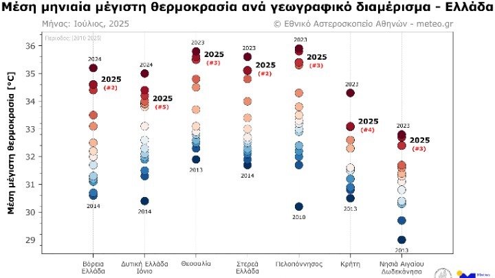 Ειδικότερα, στη Βόρεια και τη Στερεά Ελλάδα, ο Ιούλιος 2025 ήταν ο 2ος θερμότερος από το 2010, στη Θεσσαλία, στην Πελοπόννησο και στα Νησιά Αιγαίου & Δωδεκάνησα ο 3ος θερμότερος, ενώ στην Κρήτη και στη Δυτική Ελλάδα & Ιόνιο ο 4ος και ο 5ος θερμότερος, αντίστοιχα, από το 2010.