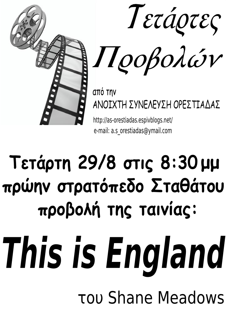 Την Τετάρτη 29/8 στις 20:30 στο πρώην στρατόπεδο Σταθάτου θα προβληθεί η ταινία “This is England” του Shane Meadows, από την Ανοιχτή Συνέλευση Ορεστιάδας.