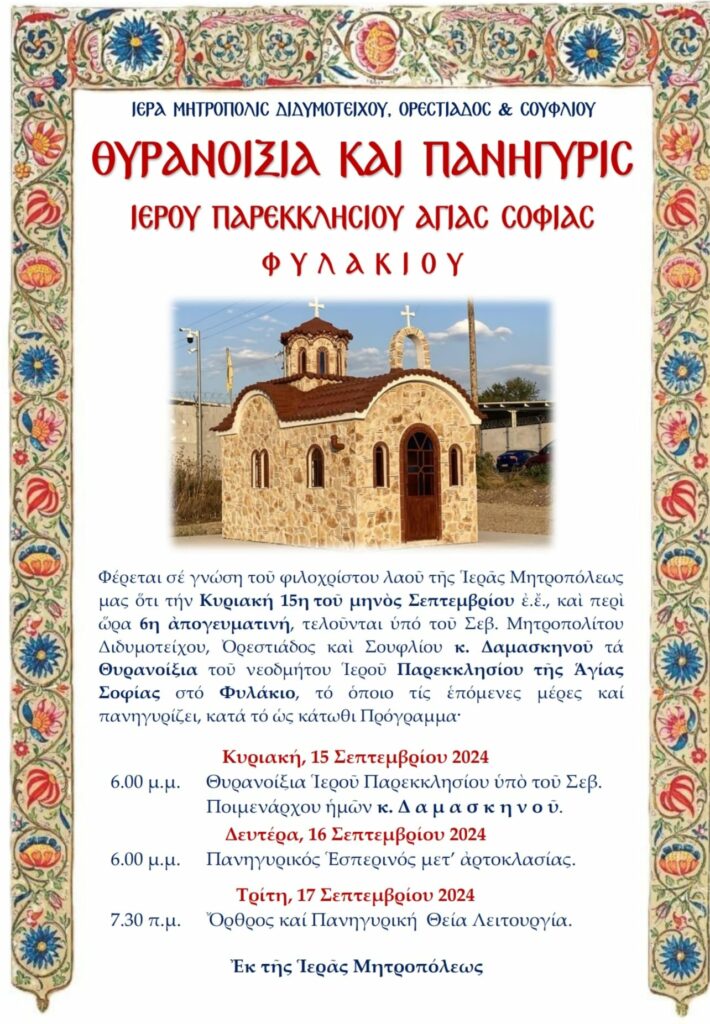 Στις 6 το απόγευμα της Κυριακής 15/9 θα τελεστούν από το Μητροπολίτη Διδυμοτείχου, Ορεστιάδας και Σουφλίου Δαμασκηνό τα θυρανοίξια του Παρεκκλησίου της Αγίας Σοφίας δίπλα στις προσφυγικές δομές ΚΥΤ και ΠΡΟΚΕΚΑ Φυλακίου Ορεστιάδας.