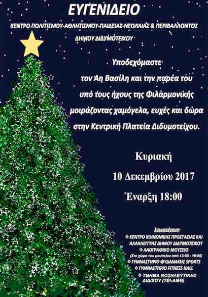 Ενόψει των Χριστουγέννων , στο πλαίσιο των εορταστικών εκδηλώσεων , το Κέντρο Πολιτισμού Αθλητισμού Παιδείας Νεολαίας και Περιβάλλοντος του Δήμου Διδυμοτείχου διοργανώνει την εκδήλωση με θέμα « το άναμμα του Χριστουγεννιάτικου δέντρου ».