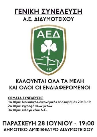 Η Α.Ε.Διδυμοτείχου ανακοινώνει ότι την Παρασκευή 28 Ιουνίου στις 19:00 θα διεξαχθεί στο Δημοτικό Αμφιθέατρο η Γενική Συνέλευση της ομάδας, όσοι αγαπάνε πραγματικά την ομάδα πρέπει να είναι εκεί,για μια ΑΕΔ δυνατή,για μια ΑΕΔ πρωταγωνίστρια,για μια ΑΕΔ ενωμένη!
