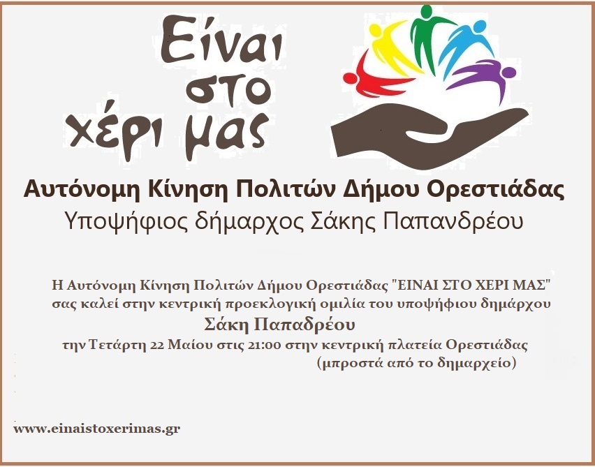 Η Αυτόνομη Κίνηση Πολιτών Δήμου Ορεστιάδας “ΕΙΝΑΙ ΣΤΟ ΧΕΡΙ ΜΑΣ” σας καλεί στην κεντρική προεκλογική ομιλία του υποψήφιου δημάρχου Σάκη Παπανδρέου την Τετάρτη 22 Μαΐου στις 21:00 στην κεντρική πλατεία Ορεστιάδας (μπροστά από το δημαρχείο).
