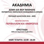 - «ΠΕΡΙΒΑΛΛΟΝ ΚΑΙ ΑΝΘΡΩΠΟΣ». Θα εγγραφούν μέχρι 100 άτομα. Χώρος διαλέξεων: Αίθουσα Δημοτικού Συμβουλίου, ημέρα Τετάρτη και ώρα 18.00 – 20.00.