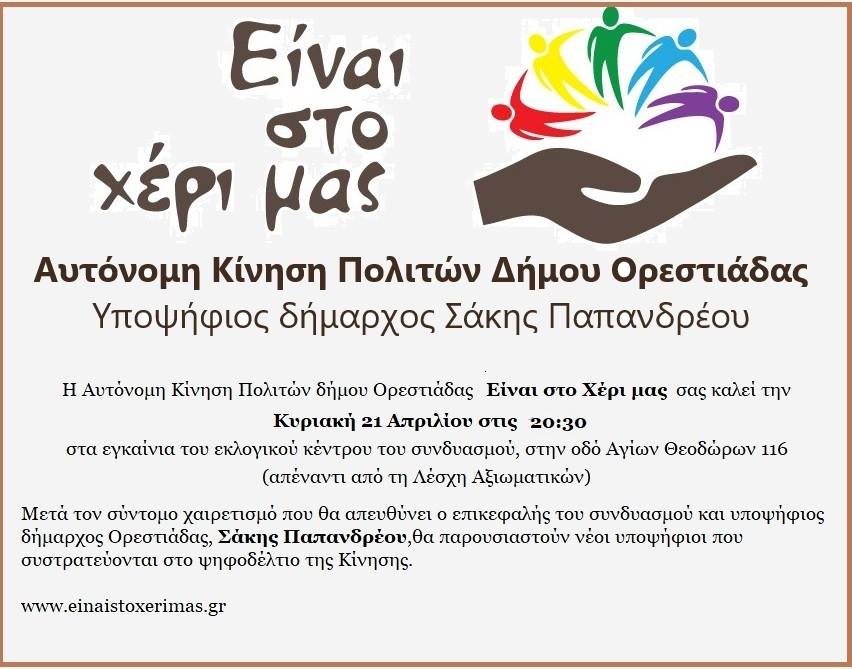 Μπαίνοντας στην τελική ευθεία που θα έχει τερματισμό μπροστά στις κάλπες των αυτοδιοικητικών εκλογών της 26ης Μαΐου, ο συνδυασμός της Αυτόνομης Κίνησης Πολιτών “Είναι στο Χέρι μας”, με υποψήφιο δήμαρχο Ορεστιάδας τον Σάκη Παπανδρέου, αποκτά τον δικό του χώρο στην οδό Αγίων Θεοδώρων 116 (απέναντι από τη Λέσχη Αξιωματικών Ορεστιάδας).