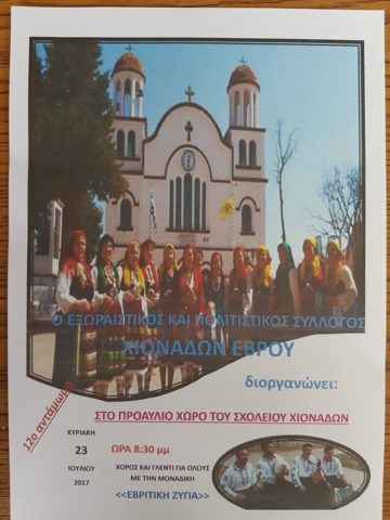 Την Κυριακή 23 Ιουλίου στον προαύλιο χώρο του σχολείου Χιονάδων σας προσκαλούν να γλεντήσετε όλοι μαζί με πολύ χορό και παραδοσιακό γλέντι με την μοναδική Εβρίτικη Ζυγιά!