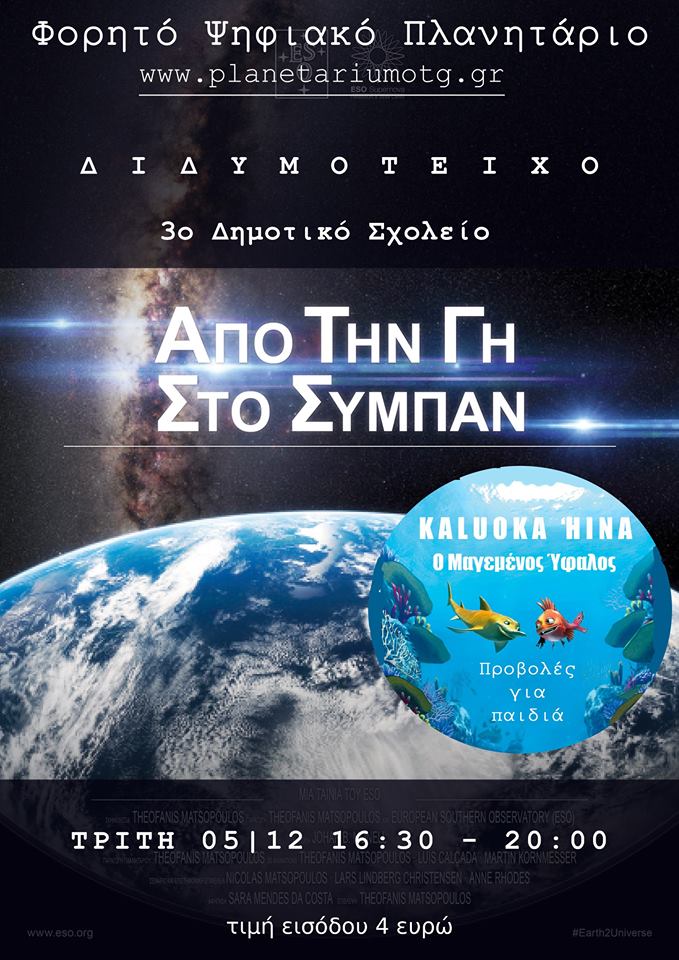 “Ο Έναστρος Ουρανός στο Διδυμότειχο”: Την Τρίτη 5 Δεκεμβρίου από τις 16:30 μέχρι τις 20:00 το Πλανητάριο ταξιδεύει μέχρι το Διδυμότειχο και το 3ο Δημοτικό Σχολείο Διδυμοτείχου! Tο Φορητό Ψηφιακό Πλανητάριο φέρνει τον έναστρο ουρανό στην πόλη του Διδυμοτείχου με προβολές των ταινιών θόλου “Από τη Γη στο Σύμπαν” και “Ο Μαγεμένος Ύφαλος – Kaluoka ‘Hina”.